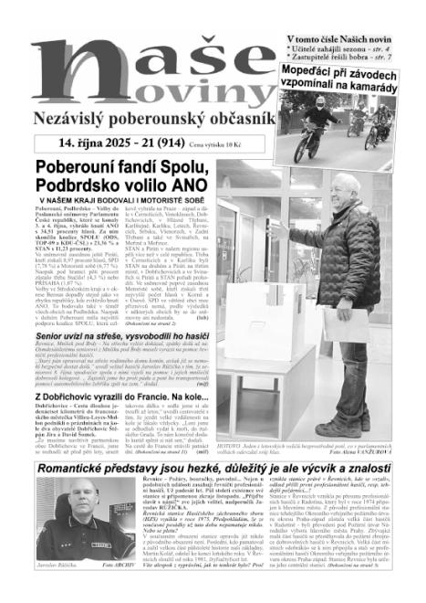 * Učitelé zahájili sezonu - str. 4 * Zastupitelé řešili bobra - str. 7 * Mopeďáci při závodech vzpomínali na kamarády * Poberouní fandí Spolu, Podbrdsko volilo ANO * Senior uvízl na střeše, vysvobodili ho hasiči * Z Dobřichovic vyrazili do Francie. Na kole… * Romantické představy jsou hezké, důležitý je ale výcvik a znalosti * Rekord v Korně: 86 procent voličů! *