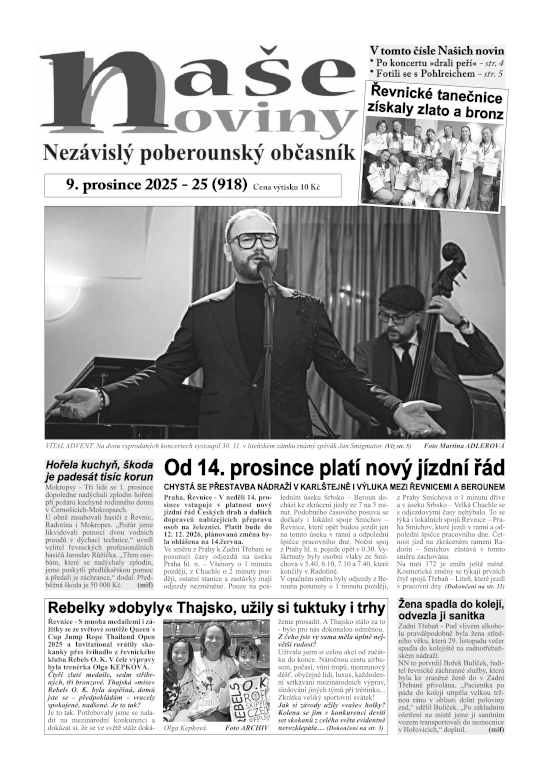 * Po koncertu »drali peří« - str. 4 * Fotili se s Pohlreichem - str. 5 * Řevnické tanečnice získaly zlato a bronz * Od 14. prosince platí nový jízdní řád * Hořela kuchyň, škoda je padesát tisíc korun * Rebelky »dobyly« Thajsko, užily si tuktuky i trhy * Žena spadla do kolejí, odvezla ji sanitka * Žabí vývar od čertů, za výkon diplom *