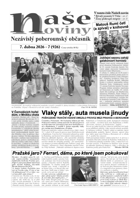 * Bývalý premiér U Věže - str. 2 * Ženy překvapil striptér - str. 8 * Matouš Ruml četl (a zpíval) v knihovně * Jubilejní sezonu zahájí galakoncert hornistů * Vlaky stály, auta musela jinudy * V Černošicích hořel dům, v Mníšku chata * Pražské jaro? Ferrari, dáma, po které jsem pokukoval * Bývalý premiér diskutoval U Věže *