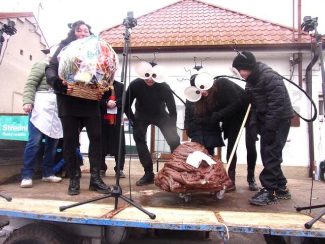 Všechny dostaly krásné ceny - tu největší, obrovský dárkový koš věnovaný druhou patronkou masopustu, starostkou Zadní Třebaně Markétou Simanovou, samozřejmě vítězné mouchy. Speciální ocenění získali malí pštrosi, kteří se nám moc líbili. Byli úžasní, strkali hlavu do písku a pěkně řádili. Opravdu parádně vymyšlené!
